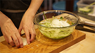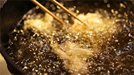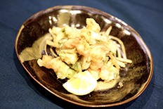 「海老とアボカドのかき揚げ」は海老のピンクとアボカドの緑で食卓に華を添えます。