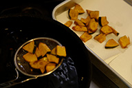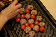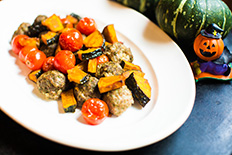 「かぼちゃとミートボール、ミニトマトのグリル」はハロウィンといえばやっぱりかぼちゃ、ミートボールとトマトと焼いてホクホクに。