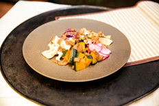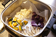 「れんこん、かぼちゃ、紫芋、エリンギのサラダ」は秋の旬の食材をふんだんに使用した体にも優しいサラダです。